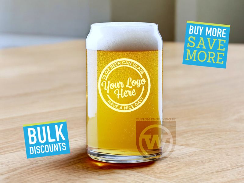 These 16 ounce beer can glasses can be engraved with your business logo or message. Perfect for gifting to clients, employees or create custom messages for your party, gathering, convention or any other event.